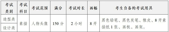 考試用具要求:①鉛筆和炭筆不得使用黑色以外的其他顏色;②8開素描紙要求:180克,漂白色、細紋,尺寸27CMX39CM,不得有顏色,不得出現(xiàn)暗紋、邊框、界格、品牌標印、折痕等標記,長寬尺寸誤差不得大于1厘米;③畫板、畫架須干凈整潔,無任何圖文;④考生不得使用規(guī)定以外的考試用具。