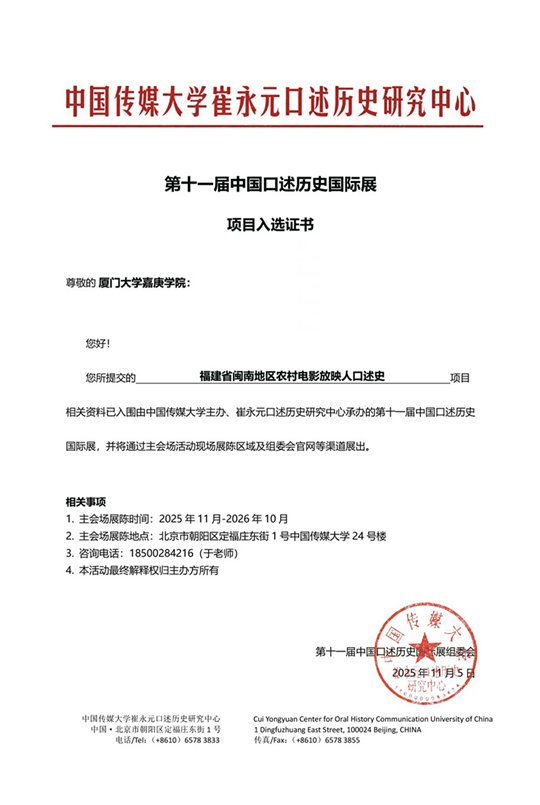 在京期間,廈門大學(xué)嘉庚學(xué)院師生團(tuán)隊(duì)全程參與了中國(guó)口述歷史國(guó)際展的活動(dòng),通過(guò)觀摩來(lái)自不同國(guó)家和地區(qū)、涵蓋多元主題的優(yōu)秀口述歷史項(xiàng)目,團(tuán)隊(duì)成員深度理解口述歷史方法論在記錄歷史、保存記憶方面的巨大潛力與前沿發(fā)展。此外,師生團(tuán)隊(duì)還前往中國(guó)電影博物館調(diào)研、采訪,館內(nèi)關(guān)于“流動(dòng)放映隊(duì)”的歷史展陳,加深了同學(xué)們對(duì)閩南農(nóng)村放映人這段歷史的理解,也讓他們更加充分地認(rèn)識(shí)到自身工作在國(guó)家電影文化宏大敘事中的定位與價(jià)值——即從微觀個(gè)體視角,補(bǔ)全與豐富中國(guó)電影歷史的脈絡(luò)。