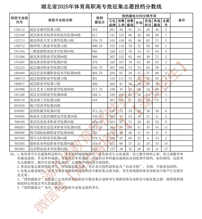 湖北省2025年體育高職高專批征集志愿投檔分?jǐn)?shù)線