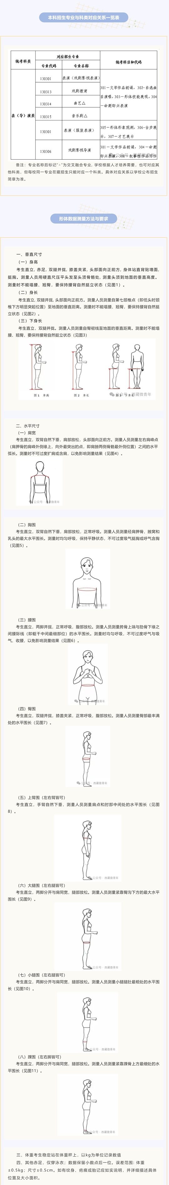 1.形體形象觀測(cè)考試目的:主要考查考生形體比例、肢體的勻稱性、協(xié)調(diào)性及膚質(zhì)等方面狀況,評(píng)價(jià)考生專業(yè)外部條件及形象氣質(zhì)等。考試形式與要求:考生先完成形體測(cè)量(測(cè)量方法與要求見附件),然后5——10人一組進(jìn)行正面、側(cè)面、背面體態(tài)展示。要求赤足、著泳裝,其中女生著純色、分體、不帶裙邊泳裝,男生著純色泳褲。