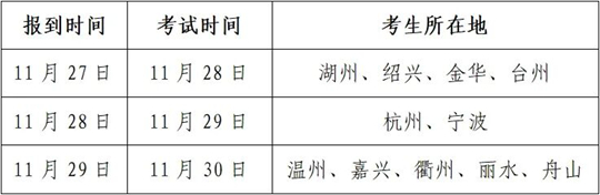 本次考試時間為11月28日—30日,按地區(qū)分三批在金華職業(yè)技術(shù)大學(xué)進行?忌氂诳荚嚽耙惶欤直救松矸葑C到組考學(xué)校辦理報到手續(xù),填寫考點規(guī)定的表格,領(lǐng)取準考證,了解考試安排情況。報到地點見金華職業(yè)技術(shù)大學(xué)招生網(wǎng)(https://zsw.jhc.edu.cn)通知。具體時間安排如下: