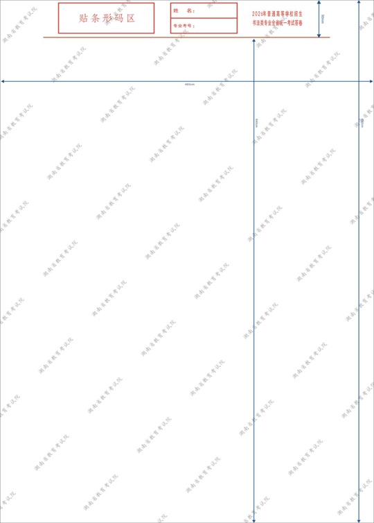 書法評卷采取計算機輔助評卷方式,要保持條形碼及條形碼粘貼區(qū)域(紅線以上區(qū)域,下同)清潔,嚴(yán)禁在條形碼上或條形碼粘貼區(qū)域涂抹。同時,請考生按照《湖南省2026年普通高校招生書法類專業(yè)統(tǒng)一考試考生守則》(見附件1)做好相關(guān)準(zhǔn)備工作。
