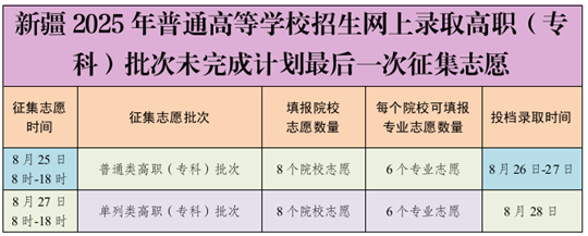 根據(jù)錄取日程安排,自治區(qū)2025年普通高等學(xué)校招生錄取高職(專科)批次未完成計劃最后一次征集志愿及投檔錄取工作將于8月25日至28日進(jìn)行。