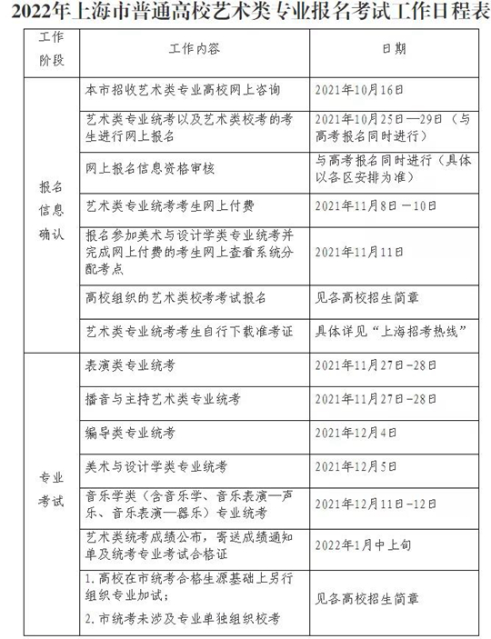 2022年上海市普通高校藝術(shù)類專業(yè)報名考試工作日程表