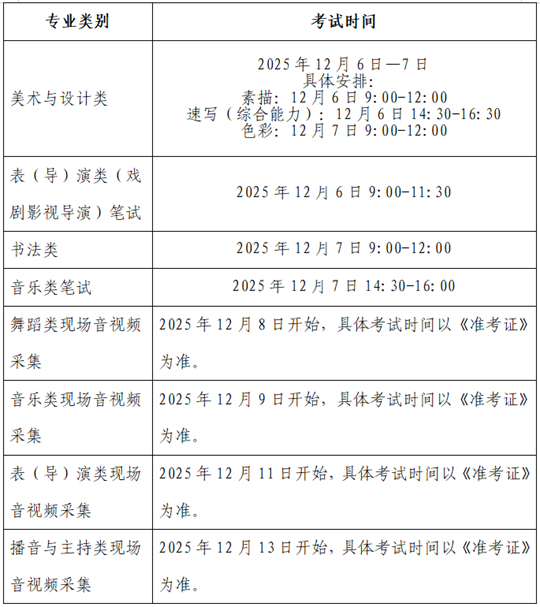 。2)藝術(shù)類專業(yè)省級統(tǒng)考筆試科目安排在2025年12月6日至7日進(jìn)行,現(xiàn)場音視頻采集科目于2025年12月8日開始。具體安排如下表: