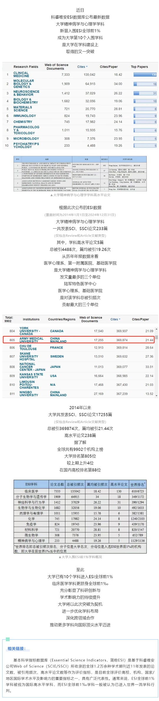 陸軍軍醫(yī)大學(xué)精神病學(xué)與心理學(xué)學(xué)科新晉入圍ESI全球前1%