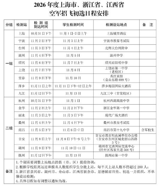| 2026年度上海市、浙江省、江西省空軍招飛初選日程安排 |