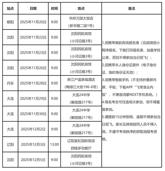 注:1.整體選拔安排說明:招飛相關(guān)環(huán)節(jié)安排綜合測試,包括但不限于飛行職業(yè)能力傾向測試、英語測試、綜合面試等考核,通過人員方可進入后續(xù)環(huán)節(jié),具體安排以當(dāng)?shù)啬虾秸酗w辦通知為準。