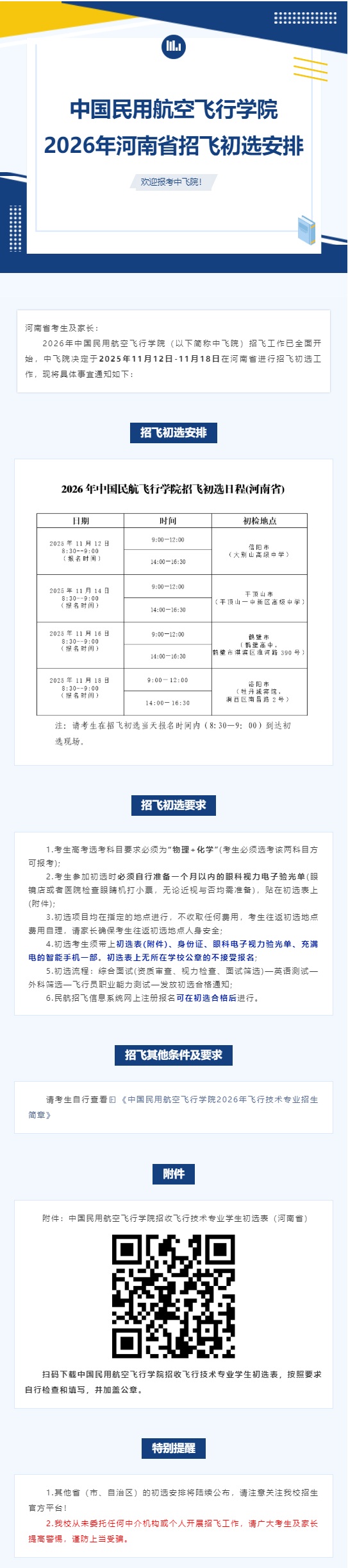 中國民用航空飛行學(xué)院2026年河南省招飛初選安排