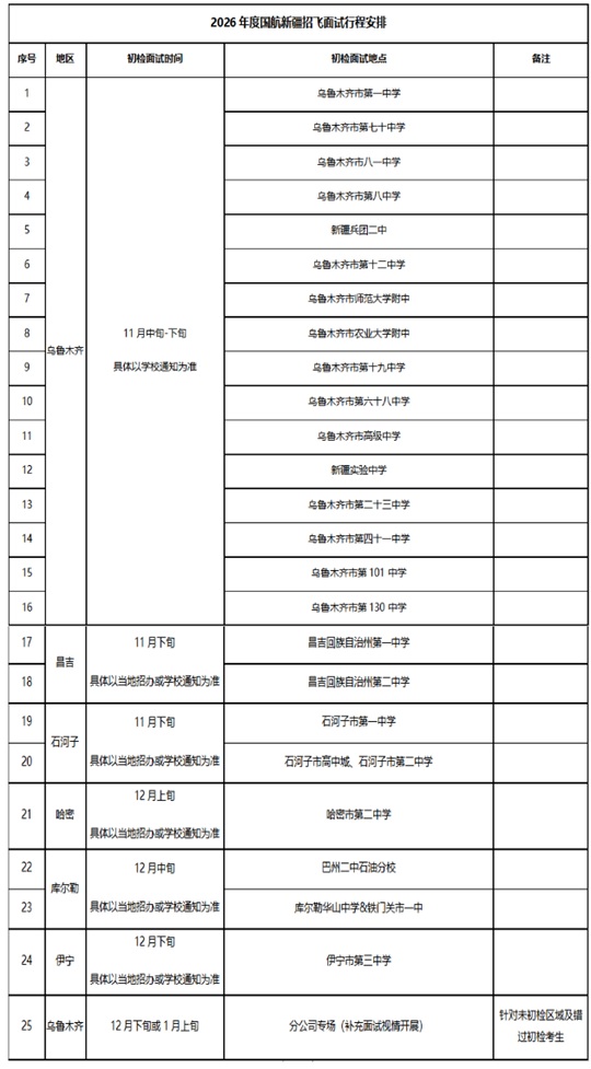 溫馨提示:初檢面試即將于2025年11月中旬陸續(xù)開展,以上安排為計劃,如有變動,由國航新疆分公司招飛辦公室與各地招生辦、學校協(xié)商后另行通知。為提升初檢面試效率,每天的初檢面試活動分為不同場次進行,請考生按照學校或短信通知的時間提前10分鐘到場。