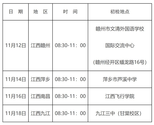 。2)各民航招飛單位將派員在我省4個設(shè)區(qū)市設(shè)點(diǎn)開展初檢,對報名考生進(jìn)行身份信息審核、目測篩選、初步檢查、英語測試等工作,考生可自行就近就便選擇站點(diǎn)參加初檢。初檢前,考生要詳細(xì)閱讀相關(guān)高校民航招飛簡章和自薦標(biāo)準(zhǔn),下載并如實(shí)填寫初檢表。
