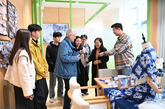 在敢當(dāng)書院,他詳細(xì)了解“一站式”社區(qū)導(dǎo)師制的運(yùn)行情況,并對(duì)學(xué)生自主設(shè)計(jì)的草本香錘、扎染等文創(chuàng)作品贊不絕口。穿梭于泰山非遺博物館與新言書院,Hans教授沉浸于地方文化的魅力,并重點(diǎn)考察了遠(yuǎn)景學(xué)院的辦學(xué)空間。