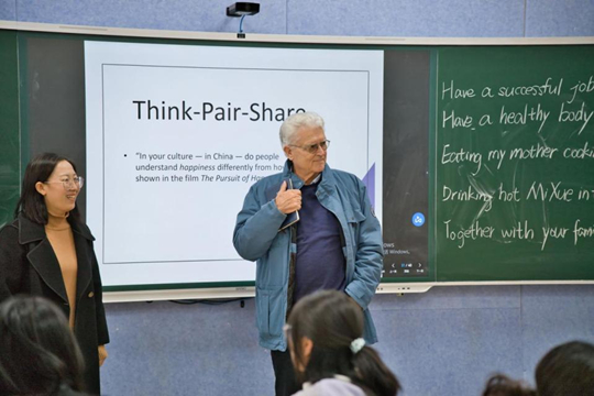 他特別鼓勵(lì)師生積極參與國際化交流,并指出:“國際化不是可選的加分項(xiàng),而是未來人才必須具備的核心素養(yǎng)!笨疾焱局校欣賞了《油畫鑒賞與實(shí)踐》課程作品展,并走進(jìn)《大學(xué)英語》課堂,親身體驗(yàn)了啟發(fā)式、互動(dòng)式的小班教學(xué)氛圍。