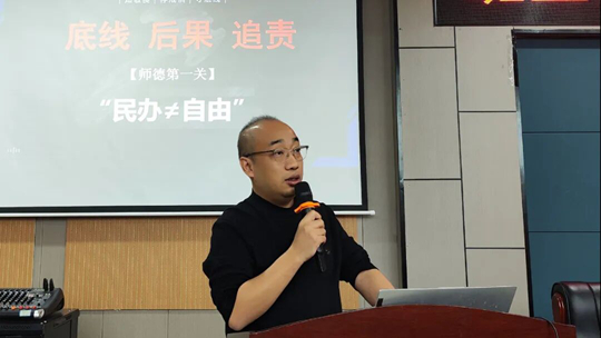 “為師者,先正觀念。”學(xué)工處處長(zhǎng)鞏非以“師德三觀”開(kāi)場(chǎng),用“民辦≠自由”當(dāng)頭棒喝,警示法治意識(shí)是班主任的“生存底線”。