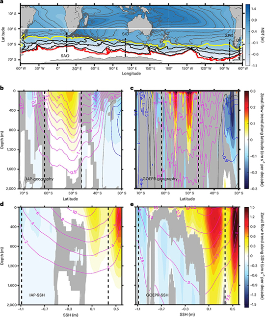 Drake Passage maintains a stable circumpolar transport”(德雷克海峽上游南極繞極流南移維持其環(huán)南極流量穩(wěn)定)的最新研究成果。該研究揭示,在最近30年全球變暖背景下,南大洋雖然因南北增暖不均造成其北部的緯向流加速,但是南極繞極流的北邊界也發(fā)生了南移,使得增強的流動被分流至亞熱帶的南大洋超級環(huán)流,從而維持了南極繞極流在其整個流域中的流量穩(wěn)定。