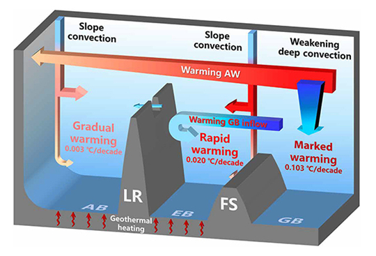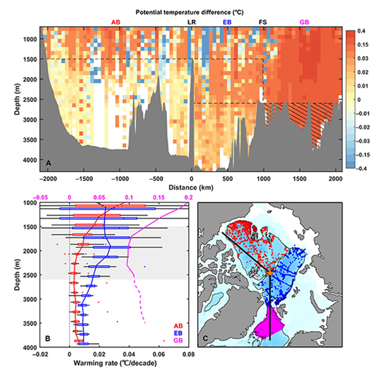 圖1. 歐亞海盆(EB)深層水變暖速率顯著快于美亞海盆(AB)