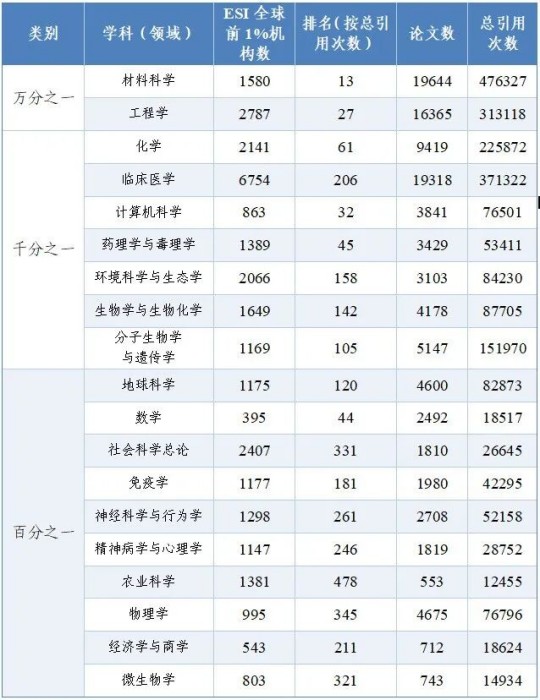 至此,中南大學(xué)擁有ESI全球前萬分之一學(xué)科2個(gè),在內(nèi)地高校中排名并列第4位。