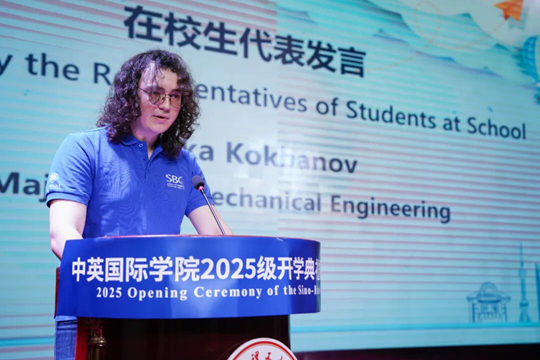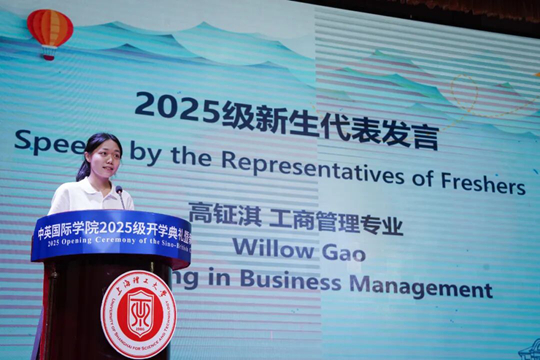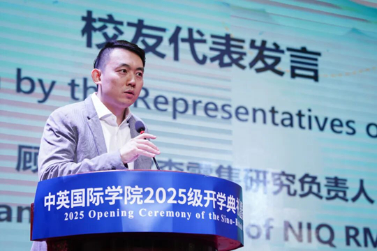 接下來,2025級新生代表高鉦淇分享了初入學(xué)院的喜悅與憧憬,希望能與所有新生同學(xué)們一起勇于探索、敢于創(chuàng)新,在國際化校園里拼搏出屬于自己的精彩。在校生代表Luka Kokhanov也分享了自己在中英國際學(xué)院求學(xué)的感受,作為一名國際留學(xué)生,期待能與新生同學(xué)們組織和參加豐富多彩的跨文化活動,共同感受中國優(yōu)秀傳統(tǒng)文化的魅力。2008級校友代表、尼爾森零售研究負(fù)責(zé)人顧問結(jié)合自身成長與職場經(jīng)歷,鼓勵同學(xué)們要專注學(xué)業(yè)的同時,也要勇敢的走出去看世界,感受不同地域的文化風(fēng)貌,在開闊國際視野的同時,不斷提升和超越自我。